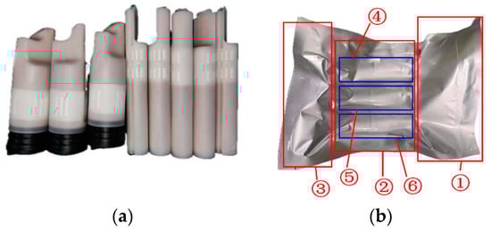 Molecular sieve drying pack. (a) NMSDP before vacuuming; (b) NMSDP after vacuuming; ① front section; ② middle section; ③ rear section; ④ target entity 1; ⑤ target entity 2; ⑥ target entity 3.