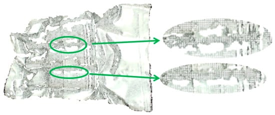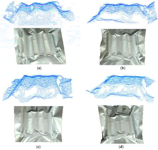 The primary objective of this paper is to employ robotic vision guidance technology to grasp the NMSDP, as illustrated in Figure 1b. The focus of this study is the NMSDP product, which is packaged in an aluminum foil bag and vacuum-sealed. The product exhibits the following characteristics: the packaging surface is non-rigid and irregular, with a significant front skirt portion that appears flat or variously raised. The middle section contains three target bodies with slight flotation, which highlights the overall outline of the product’s main body. The tail skirt section is highly complex, featuring raised edges, curled edges, depressions, and various irregular shapes, which complicates segmentation. As demonstrated in Figure 2, cavities in the point cloud data are inevitable during the packaging point cloud imaging process due to the influence of the aluminum foil material and shape. These cavities are generally distributed along the concave edges near the target bodies, and the surface quality is uneven, which affects the accuracy of pose estimation. Therefore, this paper conducts a study on 6D pose estimation for this type of packaging to enable precise robotic grasping.
