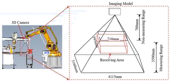 As illustrated in Figure 3, the system is built upon a palletizing robot, forming the vision-guided NMSDP packaging system. The system consists of three main components: a palletizing robot, a product transportation platform, and a 3D camera. The palletizing robot employed is an ESTUN four-axis robot ER60-2000, featuring a working radius of 2 m and a load capacity of 60 kg. At the robot’s end effector, a sponge suction cup measuring 294 mm × 130 mm × 70 mm is mounted via a fixture. Opposite the suction cup, an RGB-D camera model FM811-IX-E1 is installed. The RGB-D camera, comprising an infrared laser emitter, an infrared camera, and an RGB camera, projects a predefined infrared pattern into the object’s surface, and the infrared camera captures the deformed pattern reflected back due to the object’s shape. By analyzing the pattern deformation, the camera computes depth data. The depth image resolution is 1280 × 960 pixels, with a depth accuracy of 1.17 mm at an 800 mm working distance. The camera’s effective depth measurement range spans from 700 mm to 3500 mm, covering a far field of view of 4115 mm × 3160 mm.