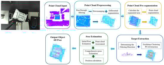 As illustrated in Figure 4, the overall framework developed for the 6D pose estimation of the NMSDP consists of three distinct procedures: pre-segmentation, target extraction, and pose estimation. First, pre-segmentation is performed based on the minimum bounding box. Second, target extraction is achieved by combining directional filtering with Euclidean clustering and PCA-based principal features. Third, feature fusion is applied for pose estimation of multiple target bodies.