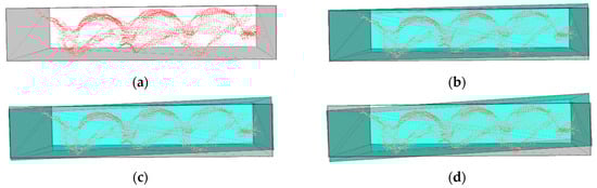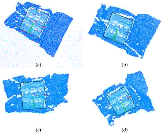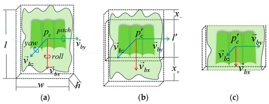In a similar manner, the point should be projected along the direction of onto the front plane, and , is rotated around . The aforementioned steps are repeated to obtain the optimal value. As shown in Figure 8b, when the rectangular solid coordinate system is rotated by and in the Roll and Pitch order, the rectangular solid better fits the surface of the packaged object. In this state, is considered to be the direction perpendicular to the surfaces of the three target bodies, thus serving as the filtering direction for the directional filter.