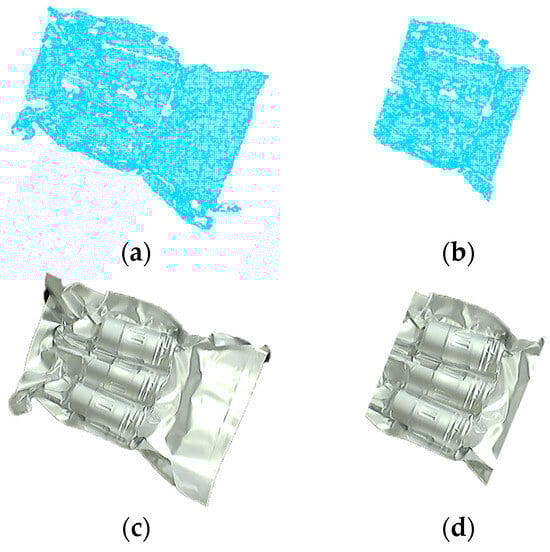 Point cloud pre-segmentation. (a) Point cloud before pre-segmentation; (b) point cloud after pre-segmentation; (c) corresponding RGB image of the point cloud in (a); (d) corresponding RGB image of the point cloud in (b).