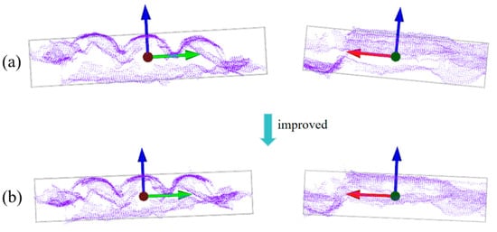 Improved minimum bounding box. (a) Front and side of the minimum bounding box: The blue arrow in the figure represents the Z-axis direction of the minimum bounding box, the green arrow represents the Y-axis direction, and the red arrow represents the X-axis direction; (b) front and side of the improved minimum bounding box.