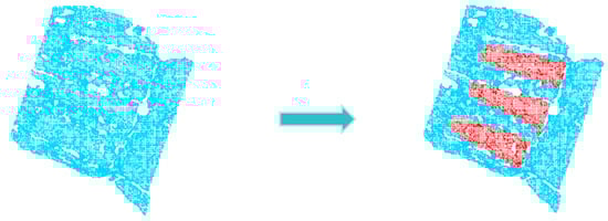 The center coordinatesof the bounding box are defined as . The spatial attitudes of the bounding box, represented by Euler angles, are denoted by and . The length, width, and height of the bounding box are represented by , respectively. The pose of the bounding box can be transformed to obtain its coordinate system, with the coordinate axis represented by three 3D vectors , , . As shown in Figure 5b, to mitigate the impact of the front blade and the rear skirt on subsequent target segmentation, regional segmentation is applied to segment these two parts. The position and size of the region are calculated and adjusted based on the current position and size of the bounding box. The adjustment rules are represented by the following formulas: