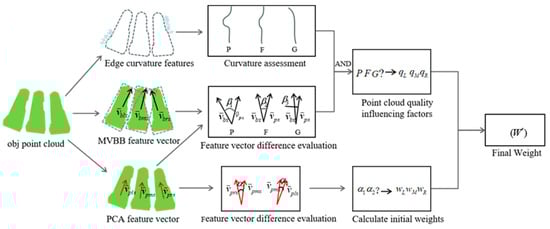 In the equation, denotes the standard deviation of the curvature along the point cloud edge while and represent the low and high standard curvature thresholds, respectively. The point cloud quality is evaluated through an integrated scoring system based on these two criteria. The comprehensive evaluation score for the target bodies M, L, and R is given by