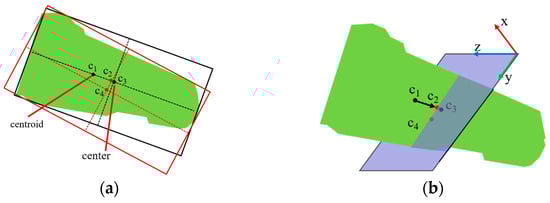 Center position compensation model. (a) Minimum bounding box enclosing object, the red frame represents the minimum bounding box surrounding the object, the black frame represents the ideal minimum bounding box, c1 is the centroid of the object, c2 is the intersection point of the short axis of the red frame and the long axis of the black frame, c3 is the ideal center of the object, and c4 is the center of the bounding box; (b) the long axis of the attitude intersects the plane of the bounding box.
