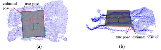 Figure 14 shows a comparison between the pose estimation method proposed in this paper and the manually annotated true pose. The red frame represents the manually annotated frame, and the blue frame is a cube generated with dimensions matching the manually annotated frame based on the target pose estimated by the method described in this paper.