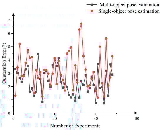 Figure 18 shows that the multi-target pose estimation method using dynamic weights yielded better results than the approach that relied exclusively on the intermediate target pose as the global pose. As shown in Table 3, the average quaternion difference values for the multi-target pose estimation were consistently lower than those for single-target pose estimation. In terms of variance distribution, the difference values for multi-target pose estimation range from 1 to 4°, while the single-target method exhibited a wider range from 1 to 6.5°, indicating larger extreme values. These results suggest that the multi-target pose estimation method, as employed in this paper, achieved greater stability and a smaller error margin when estimating the poses of actual targets, meeting the practical requirements for robot pose grasping when using only initial weights.