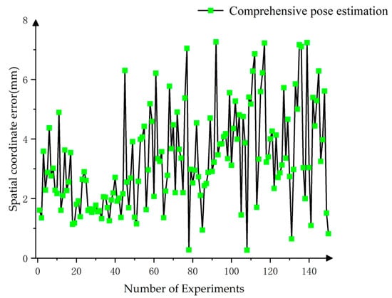 The results indicated an overall spatial distance error of 3.278 mm, which was relatively small. Figure 21 presented the line chart of spatial coordinate errors for each data set, showing that the error distribution was primarily within the 1–7 mm range. A substantial portion of the data in the figure showed an error margin of approximately 7 mm, primarily due to variations in the X direction. This was because the central target’s position was more prominent in the X direction compared to the surrounding targets. Specifically, the center of the central target exhibited a significant error in the X direction relative to the overall center of the target ensemble. Despite a few outliers, the errors remained within 1 cm, fulfilling the requirements for robotic target center positioning.
