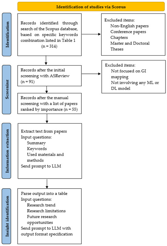 Finally, some novel parts that were used in this report should be highlighted (Figure 2). Screening time was considerably shortened using the ASReview software developed by van der Schoot et al. [36]. This open-source ML tool enables the screening and systematic labeling of a large collection of textual data. Systematic reviews are usually time- and resource-intensive, requiring a median of five researchers and 41 weeks to submit to a journal [100]. Nowadays, state-of-the-art strategies are being developed to automate systematic literature reviews [101]. After paper identification and screening of the articles, an LLM (i.e., OpenAI’s GPT-4 model) was used to extract information and identify findings. As mentioned by Ito et al. [32], when using an LLM one needs to pay special attention to hallucinations (i.e., generation of non-factual information), and they suggest an extensive examination of the method used for the automation of a systematic review in order to make a rigorous validation of the accuracy and quality of the outputs. Therefore, we manually checked 10% of the total papers to confirm that the LLM model generated a reasonable output.