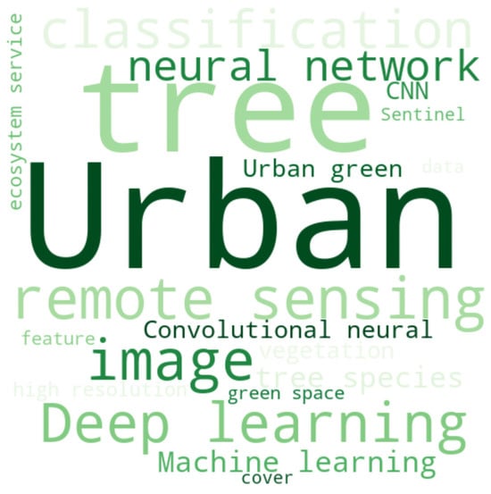 As mentioned above, the European Commission defines green infrastructure as a “strategically planned network of natural and semi-natural areas with other environmental features designed and managed to deliver a wide range of ecosystem services” [42]. However, there is no agreement on the components of GI nor on the methods to identify and map them [43]. As a result, the concept of GI has been defined and linked in different ways [9], leading to the emergence of different terms and concepts to describe the same idea (e.g., green-prints, natural asset maps, ecological networks, green, blue, brown, and black corridors). Figure 3 therefore shows the most frequent keywords mentioned in the papers that met the search conditions in the Scopus database and the manual screening. The observed category, i.e., green infrastructure mapping, showed a high frequency of words such as ‘urban’, ‘image’, ‘tree’, ‘remote sensing’, and ‘deep learning’.