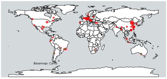 Distribution of the study areas used in the reviewed papers.