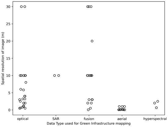 As mentioned above, high-spatial resolution optical remote sensing (RS) imagery is still the most frequently used data source for GI mapping. The data sources for the case studies are mainly from RS satellite imagery such as Gaofen [45,46,80,81,82,83], Sentinel-2 [44,84,85,86,87], or the data from Digital Globe (e.g., WorldView, GeoEye, QuickBird) [25,28,47,53]. Some of the studies exclusively used RS imagery obtained from the PlanetScope [14,16], BJ-3N [88], Landsat [52], or SPOT6 [89] satellites. In addition, the spatial resolution of the data used determines the scope of the study. In general, high spatial resolution imagery is used for mapping individual trees, medium spatial resolution imagery is used for mapping GIs at the neighborhood or city level, and low spatial resolution imagery is used for the conservation of functional ecosystems at the regional and national level. The relationship between the spatial resolution of the imagery used in the case studies examined and the type of data used for GI mapping is shown in Figure 5.