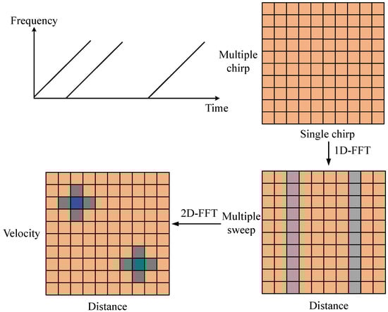 After processing the radar signal with a 2D-FFT, a range–Doppler feature map can be constructed, as illustrated in Figure 2. The ADC sampling backend data are stored in a two-dimensional matrix, organized by chirps. Multiple chirp times are referred to as the slow-time domain, while a single chirp time is called the fast-time domain.