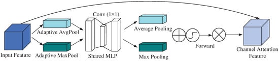 The channel attention mechanism compresses the channel information of the input feature map. Its main function is to adaptively adjust the weights of different channels in the feature map, enhancing the network’s focus on key channel information while suppressing the influence of less important channels. Without significantly increasing computational cost, this mechanism optimizes feature representation, thereby improving the accuracy of classification tasks. Specifically, it first performs average pooling and max pooling operations on the feature map channels, then passes the pooled results through a shared network to adjust the channel weights and obtain fused features. These fused features are then processed by an activation function to generate weight parameters, which are finally multiplied by the input feature map to obtain new features. The structural principle is shown in Figure 3.