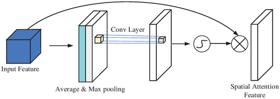 The spatial attention mechanism enhances the model’s focus on the most informative regions of the feature map, effectively improving feature representation. By leveraging average pooling and max pooling along the channel axis, it generates two weight vectors, which are combined to form a descriptor. This descriptor is then convolved and processed using a normalization function to derive the weight parameters. These parameters are subsequently multiplied with the input feature map to emphasize critical spatial regions and suppress irrelevant ones, resulting in refined features. The structural schematic is illustrated in Figure 4.