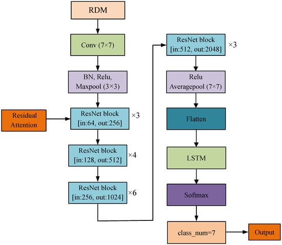 In summary, we propose a network model based on the residual attention mechanism, as depicted in Figure 7. The proposed network architecture takes the range–Doppler map (RDM) as input and incorporates a residual attention mechanism to enhance feature extraction. This mechanism processes features through two convolutional layers, followed by channel attention and spatial attention modules, which selectively emphasize important gesture-related features while suppressing irrelevant ones. The combined outputs are added to the original feature map and activated using a ReLU function, enabling the network to focus more effectively on gesture-specific information.