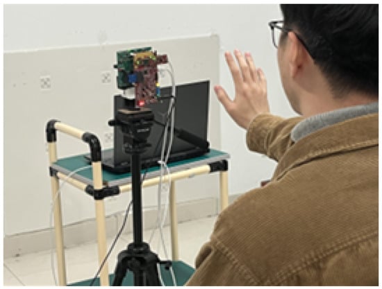 The primary application scenario of this study focuses on enabling drivers to interact with in-car smart devices using hand gestures, thereby reducing the risk of distracted driving accidents. Considering the driver’s posture and the in-car environment during vehicle operation, the dataset was collected under conditions that closely simulated real driving scenarios. Specifically, experimental subjects were seated in front of the radar, as illustrated in Figure 8, with hand gestures recorded at a distance of approximately 30 cm from the radar. This setup was designed to replicate the driver’s actual interaction environment during data recording, ensuring the relevance and practicality of the dataset for the intended application.