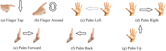 For the driving process considered in this paper, we designed a total of seven kinds of gestures, respectively: finger click, finger around the circle, palm left, palm right, palm forward push, palm back pull, and palm up row. Each specific gesture action is shown in Figure 9.