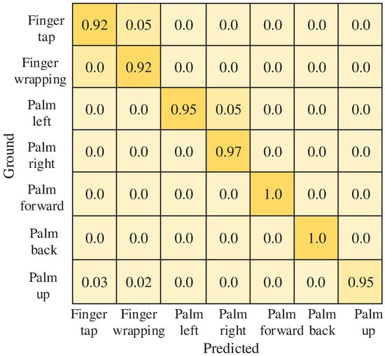 The recorded gesture dataset, comprising data from 10 users, is divided into training and test sets with a ratio of 8:2. The RLA gesture recognition algorithm’s network model, as proposed in this paper, is first trained using this dataset. Figure 10 presents the confusion matrix illustrating the algorithm’s recognition accuracy for different gestures within the dataset. The depth of the color represents the level of accuracy. From this confusion matrix, it is evident that the trained model effectively distinguishes between gestures, achieving accurate recognition for movements like pushing the hand forward and pulling the hand backward. Additionally, the model demonstrates strong recognition performance for other movements within the self-constructed dataset.