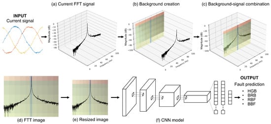 Overview of the background-enhanced FFT signal processing for fault detection. In (a), the original current FFT signal is displayed. In (b), the distinctive background is created. In (c), the background is combined with the FFT signal, forming a unified representation. (d) shows the final background-enhanced FFT image. In (e), the image is resized to a pixels. Finally, (f) represents the input to a CNN model for automatic fault detection.