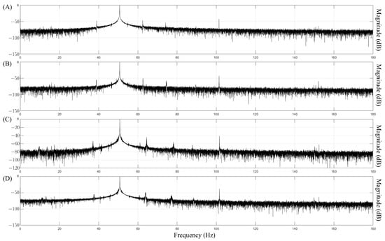 Fourier spectra of the current signals for each fault type at 1500 rpm and 100% load. (A) HGB, (B) BRB, (C) RBF, and (D) BBF. The x axis represents the frequency in Hz (up to 180 Hz for visualization), and the y axis represents the magnitude in decibels (dB). The model analyzes frequencies up to 100 Hz.