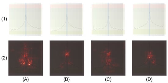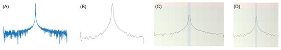 Transformation process of the FFT image. (A) Original FFT signal. (B) Smoothed signal after applying the Savitzky–Golay filter of degree 3. (C) Smoothed signal with a degraded background, including horizontal and vertical reference stripes. (D) Final resized image (224 × 224 pixels) prepared for input to the CNN model.