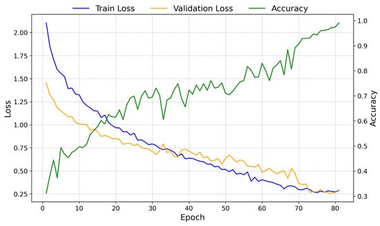 Figure 4 illustrates the training and validation loss curves, along with the training accuracy throughout the training process. The convergence behavior of the model is observed in the loss curves, while the accuracy curve shows the performance improvement across epochs. At epoch 81, the system achieved an accuracy of 0.991 on the validation set.