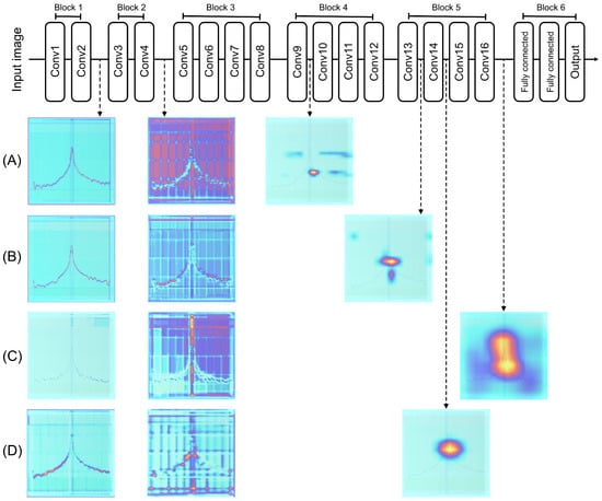In the output of the first convolutional block (layer 2), the activations were directly concentrated on the line corresponding to the FFT for all classes, indicating that this block captures the features related to the signal. In block 2 (layer 4), the activations highlight the enhanced background, where red zones appeared in a grid pattern, while the signal remained blue, suggesting that this block primarily focuses on the background. As the convolutions progressed, the activations became more specific to each class.
