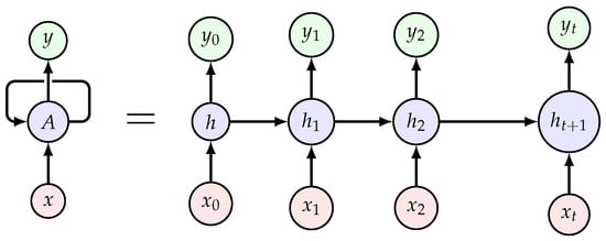 A Recurrent Neural Network (RNN) is a type of Artificial Neural Network in which the output is influenced not only by the current input, but also by historical data. RNNs are particularly effective for data with sequential dependencies, such as time series or spatial trajectories. For example, in indoor localization, a user’s current position is related to their previous positions due to the continuous nature of their movement. RNNs exploit this sequential relationship by using past measurements and trajectory information to improve localization accuracy. Figure 2 presents the scheme of an RNN. Essentially, an RNN works by processing sequences of data, allowing it to account for temporal dependencies in its predictions. An RNN is a function defined by (1), and the output is presented by Equation (2) []: