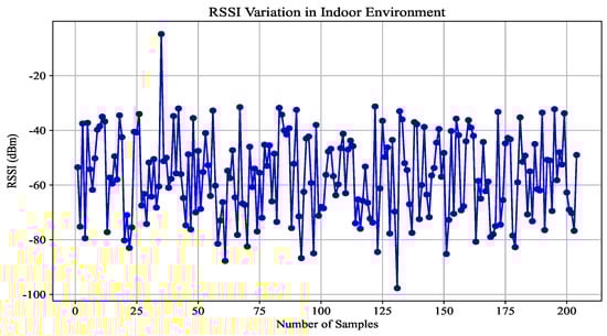 where d represents the distance between the transmitter and the receiver device, while is the reference distance. The term RSSI denotes the Received Signal Strength Indicator (RSSI) value measured by the device at the reference distance . Additionally, refers to the Gaussian-distributed noise with a mean of zero and a variance of . The path loss exponent is denoted by , which characterizes how signal strength diminishes with environmental factors. Among the various techniques used for indoor positioning, Received Signal Strength Indication (RSSI) is one of the most widely used methods due to its low cost. However, distance estimation using the RSSI path loss model remains a challenging task, especially in complex indoor environments. An accurate determination of critical parameters, including the RSSI distribution and the path loss exponent , is vital in improving positioning accuracy. This is particularly important in non-line-of-sight (NLOS) conditions, where environmental factors significantly affect the characteristics of the wireless communication channel. Overcoming these challenges can lead to significant improvements in the accuracy of indoor positioning systems []. Figure 4 shows an example of RSSI values obtained from more than 200 repeated measurements for a fixed distance between two sensor nodes, wherein we can observe the variation in the measurement, which causes the problem of measurement accuracy and significantly affects the precision of the predicted distance.