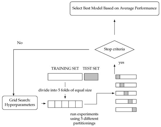 The accuracy value can be optimized by using grid search cross-validation. Grid search is the process of selecting a combination of models and hyperparameters by testing the combinations one by one and validating each combination. The goal of grid search is to determine the combination that produces the best model performance that can be selected to be used as a model for prediction []. Grid search is usually combined with k-fold cross-validation, which provides an evaluation index for the classification model. The k-fold cross-validation process is detailed in Figure 6.