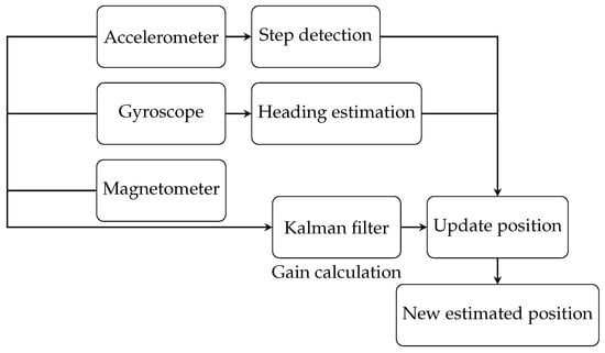 In the second scenario, we used a Kalman filter with heading estimation to determine the position of the target. The position estimation process is shown in Figure 8. This estimation is based solely on processed 9-axis measurements from the ICM-20948 sensor, which integrates data from the accelerometer, magnetometer, and gyroscope. The Kalman filter gain was calculated using these 9-axis measurements. Since our localization is in 2D, only the x- and y-axis values were used.