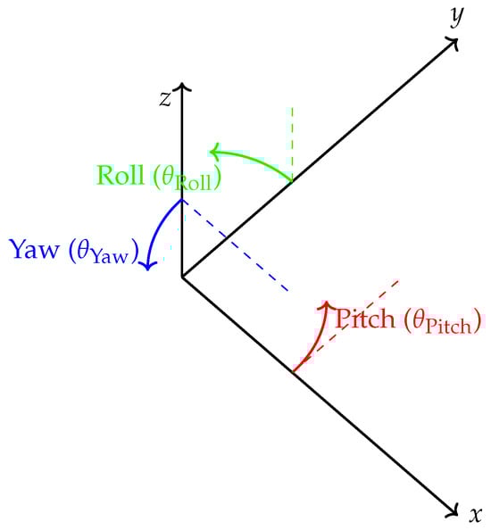 For step detection, we used pitch and roll angles derived from Euler angles to estimate step length. Our target is stationary. Euler angles are defined in Figure 9. In this context, pitch refers to rotation around the x-axis, roll refers to rotation around the y-axis and yaw refers to rotation around the z-axis. To calculate the pitch and roll angles, we used Equations (11) and (12) []: