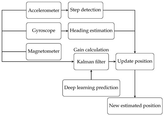 Recent research has focused on integrating machine learning algorithms into IPSs to achieve higher accuracy. Algorithms like Artificial Neural Networks (ANNs) and Long Short-Term Memory (LSTM) [] have shown promise in optimizing indoor positioning accuracy. However, the Kalman filter combines noisy sensor measurements with dynamic model predictions to provide refined position estimates over time []. The advancement of machine learning and deep learning technologies in indoor localization systems has made significant progress, but real-time evaluation remains a significant challenge.