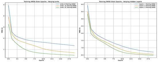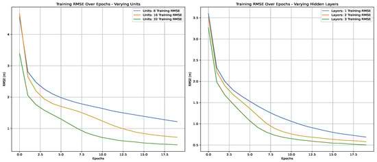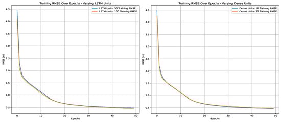 Using the cross-validated grid search in the first scenario, we tried to find the best hyperparameters for the studied three deep learning techniques. Figure 11, Figure 12 and Figure 13 present the variations in RMSE through the epochs for different hyperparameters. The best parameters are summarized in Table 9. The LSTM model has one layer with 100 units and 32 dense units. Both the RNN and ANN models have three layers with 32 units.