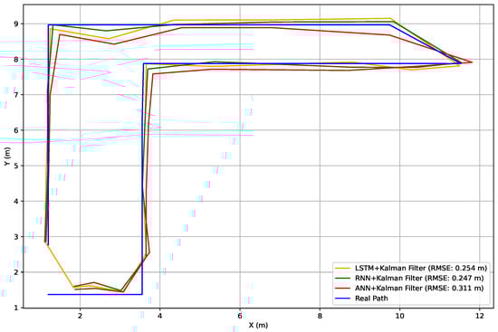 For the second scenario, we used the Kalman filter for the 9-axis of the ICM-20948. The proposed algorithm achieves a Root Mean Square Error (RMSE) of 3.34 m. In the third scenario, by integrating the Kalman filter with deep learning models, we observe improved performance compared to the first and second scenarios. Prior to this combination, the RMSE values for the ANN, RNN, and LSTM were 0.46 m, 0.41 m, and 0.51 m, respectively. After applying the hybrid solution in the third scenario, the RMSE using the predicted positions from the ANN decreases to 0.311 m, while the RMSE using predictions from the RNN and LSTM reduces to 0.247 m and 0.254 m, respectively. Figure 14 presents a comparison between the real path and the hybrid models.
