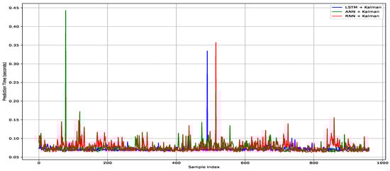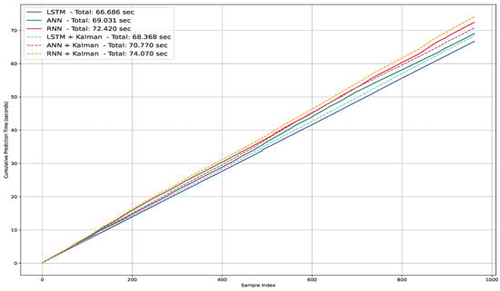 Using the hybrid models, the prediction per sample was still relatively the same. Figure 15 presents the prediction time for hybrid models. By combining the Kalman filter with deep learning models, the total prediction time increased from 66.686 s to 68.368 s when using the LSTM with the Kalman filter. For the RNN and ANN combined with the Kalman filter, the prediction times increased to 74.070 s and 70.770 s, respectively. The predictions for each sample remained stable at 0.077 s, 0.074 s, and 0.071 s for the RNN, ANN, and LSTM models combined with the Kalman filter, respectively. Figure 16 presents a comparison between the hybrid models and the classic models.