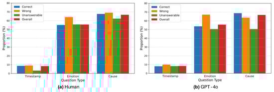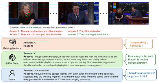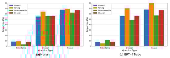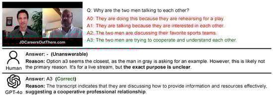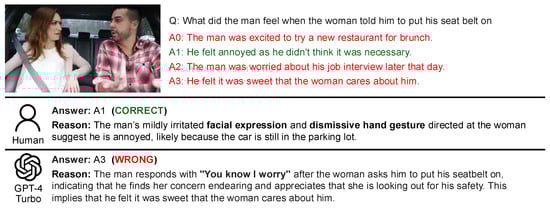 An analysis was conducted on the response patterns arising from the combinations of Human: correct, wrong, unanswerable and GPT-4 Turbo: correct, wrong, unanswerable. The analysis comprised two components: (1) a manual review of five samples for each pattern, and (2) a trend analysis using GPT-4 Turbo on the complete set of samples. For the manual analysis, five samples were randomly selected for each pattern from the video–question pairs. Each sample was examined to review the question, the options, the human responses with their reasoning, and GPT responses with their reasoning. For the GPT-4 Turbo-driven trend analysis, the system was provided with the questions, options, human responses with their reasoning, and GPT responses with their reasoning for the video–question pairs in each pattern. The system was then instructed via a prompt to output findings under three categories: (1) commonalities between humans and the LLM, (2) differences between humans and the LLM, and (3) the characteristics of Social-IQ 2.0 QA. Subsequently, the outputs for each pattern were manually reviewed and synthesized into a comprehensive summary. The actual data and responses used in the analysis are presented in Figure 3 and Figure 4.