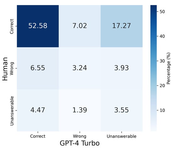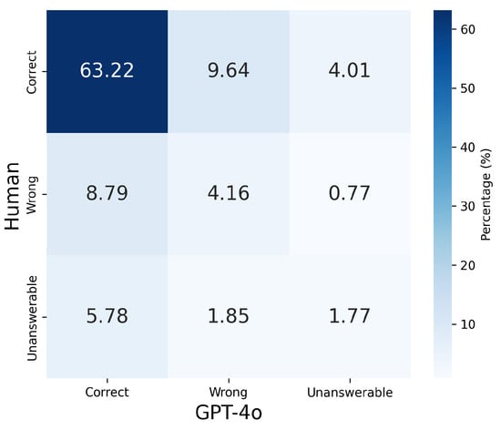 From Table 3 and Figure 5, it can be observed that GPT-4o exhibits response tendencies that are closer to those of humans compared to GPT-4 Turbo. There are more instances where both GPT-4o and humans answered correctly or marked the question as unanswerable. Additionally, compared to GPT-4 Turbo, GPT-4o demonstrated fewer unanswerable responses and more correct answers for samples where humans either answered wrongly or marked the question as unanswerable. This improvement can likely be attributed to the differences in the amount of information captured by the images and captions, as well as the impact of multimodal pretraining, which enhances GPT-4o’s ability to integrate and effectively utilize information from multiple modalities.