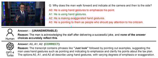 - Utilization of non-verbal information —Unlike LLMs, humans retain all information related to the video and excel in reasoning that integrates multiple modalities.