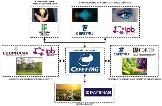 Leuphana University and the Polytechnic Institute of Bragança take the lead in robot modeling and control, developing advanced controllers and implementing control allocation techniques for all agents, with support from CEFET-MG members. Furthermore, IPB members, in collaboration with CEFET/RJ and FEUP, focus on applying CV techniques and artificial neural networks (ANNs) for detecting agricultural challenges such as irrigation deficiencies and pest infestations. Meanwhile, FAMINAS contributes essential biological insights by analyzing visual patterns in plantations to inform the development of ANN-based detection models. Finally, IFPB team members focus on product consolidation, conducting feasibility studies to ensure the project’s economic and technical viability, aligning its outcomes with market demands.