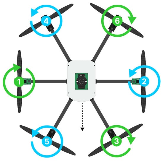 However, to better comprehend the forces and torques produced by the six HTR operating motors, it is crucial to understand the directions of rotation for each motor, as these influence the propulsive forces and angular moments. Then, the propulsion motors with their respective directions of rotation are shown in Figure 5: