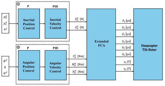 From the forces and torques, gravitational and aerodynamic forces are inherent to the HTR’s characteristics; thus, the virtual control actions (VCAs) are performed only by the propulsion forces and torques, which are directly related to real control actions (RCAs) [41]. Consequently, the HTR CEM is: