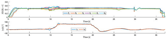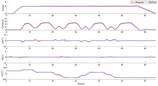 In contrast, the pitch remained close to zero, which aligns with the expected performance since the tilt rotors are responsible for this control function. Also, the yaw had more changes due to the HTR’s nose adjustments, which were required to follow the trajectory, confirming the efficiency of maintaining the correct heading throughout the flight.