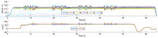 In terms of attitude, the HTR exhibited a higher roll angle during the first orientation adjustment at s. In contrast, in the following instants, the traditional hexacopter displayed higher roll angles. The difference in pitch is particularly notable due to the HTR’s efficiency in covering distances, maintaining 0 degrees of pitch throughout the trajectory, with angles of ±0.5°. In contrast, the traditional hexacopter relied on forward pitching (around −30°) to generate linear movement. In terms of yaw, both hexacopters displayed similar responses in this scenario.