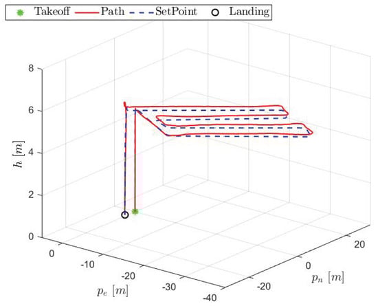 The external controller is responsible for maintaining the inertial position, specifically controlling altitude (h) and the north and east positions, () and (), respectively. The P controller was adopted for its capability of fast response to changes and its efficiency, while the PID controller was adopted for its easy implementation. Moreover, the position and velocity inertial loop operates at a rate of 50 Hz.