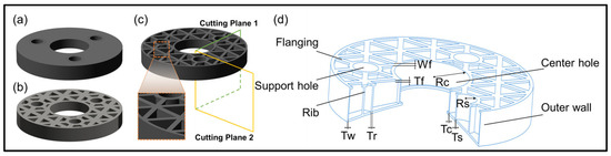 In engineering, large-aperture primary mirrors are commonly categorized into three types based on their flanging types (as shown in Figure 1): closed, open, and semi-closed. The type of flanging can affect the quality, stiffness, and deformation after application of load. This article is based on the initial structure of a 672 mm diameter mirror used in a certain theodolite, which features a semi-closed structure with triangular lightweight ribs. It includes a through-hole in the center and three evenly distributed support holes, as shown in Figure 1d. A model was constructed using COMSOL simulation software, and key structural parameters of the mirror were assigned as variables. This approach avoids redundant modeling in subsequent optimization and analysis, facilitating the attainment of the desired results. The main structural parameters of the mirror include the thickness of the outer wall (Tw), the radius of the support hole (Rs), the thickness of the support hole (Ts), the radius of the central hole (Rc), the thickness of the central hole (Tc), the thickness of the ribs (Tr), the thickness of the flanging (Tf), and the width of the flanging (Wf). For the mirror, the dimensions of the structural parameters will affect both its mass and stiffness. In the design of the initial structure, the goal should be to minimize the mass as much as possible while ensuring that the mirror’s fundamental frequency is significantly higher than the external low-frequency vibrations.