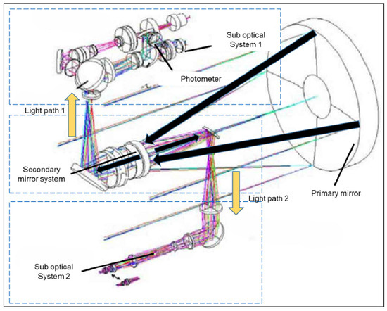 For the vehicle-mounted photoelectric theodolite, the primary mirror, as a crucial component of the optical imaging system, plays a key and decisive role in the imaging quality of the entire optical path, with its surface shape accuracy (RMS value) being of paramount importance. The optical path of the primary optical system is shown in Figure 2. Light first reflects off the primary mirror into the secondary mirror system, which then splits the light path into sub-imaging systems 1 and 2. Therefore, for the entire optical system, the structural design of the primary mirror determines the imaging quality and is also the key to the design and optimization of the optical system.