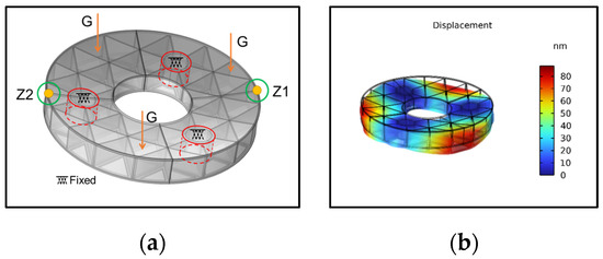 Mirror deformation under gravity. (a) Boundary conditions; (b) displacement under gravity.